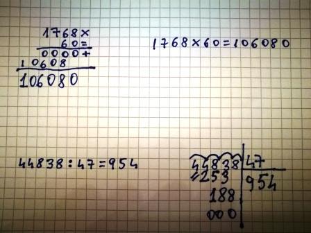 Compiti di matematica: addizione e moltiplicazione 30 Settembre 2019 di rino MOLTIPLICAZIONE:1768 x 60 = 106080DIVISIONE:44838 : 47 = 954